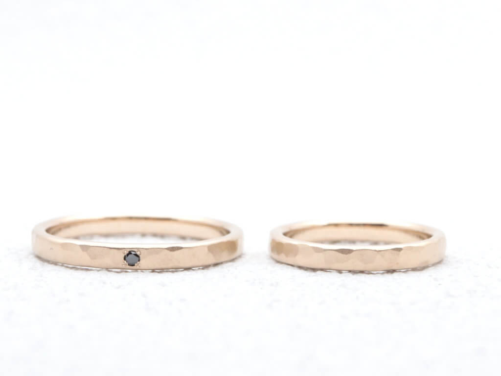 こちらの結婚指輪はどちらもシャンパンゴールドに、槌目加工をして、そのあとにブラスト(マット加工)を施しています。
