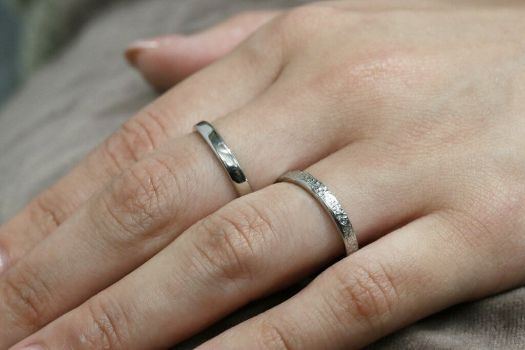 つやつや輝くプレーンのリングと槌目(ハンマー)テクスチャ、つや消しのブラストでは、質感が異なります。また、色の見え方も違います。