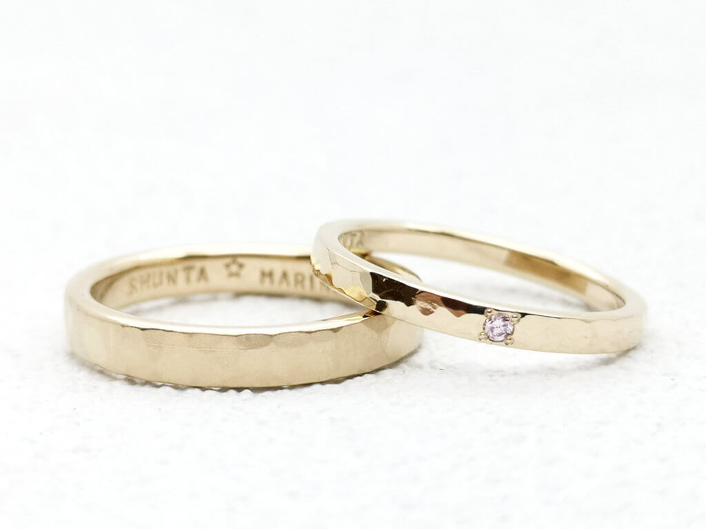 ゴールドのリングは派手というイメージがあるかもしれませんが、例えば、MITUBACIで取り扱っているシャンパンゴールドというゴールドは、プラチナとイエローゴールドの間のような色合いをしており、結婚指輪らしい輝きを残しつつ、さらっと着けられるため男女ともに人気です。
