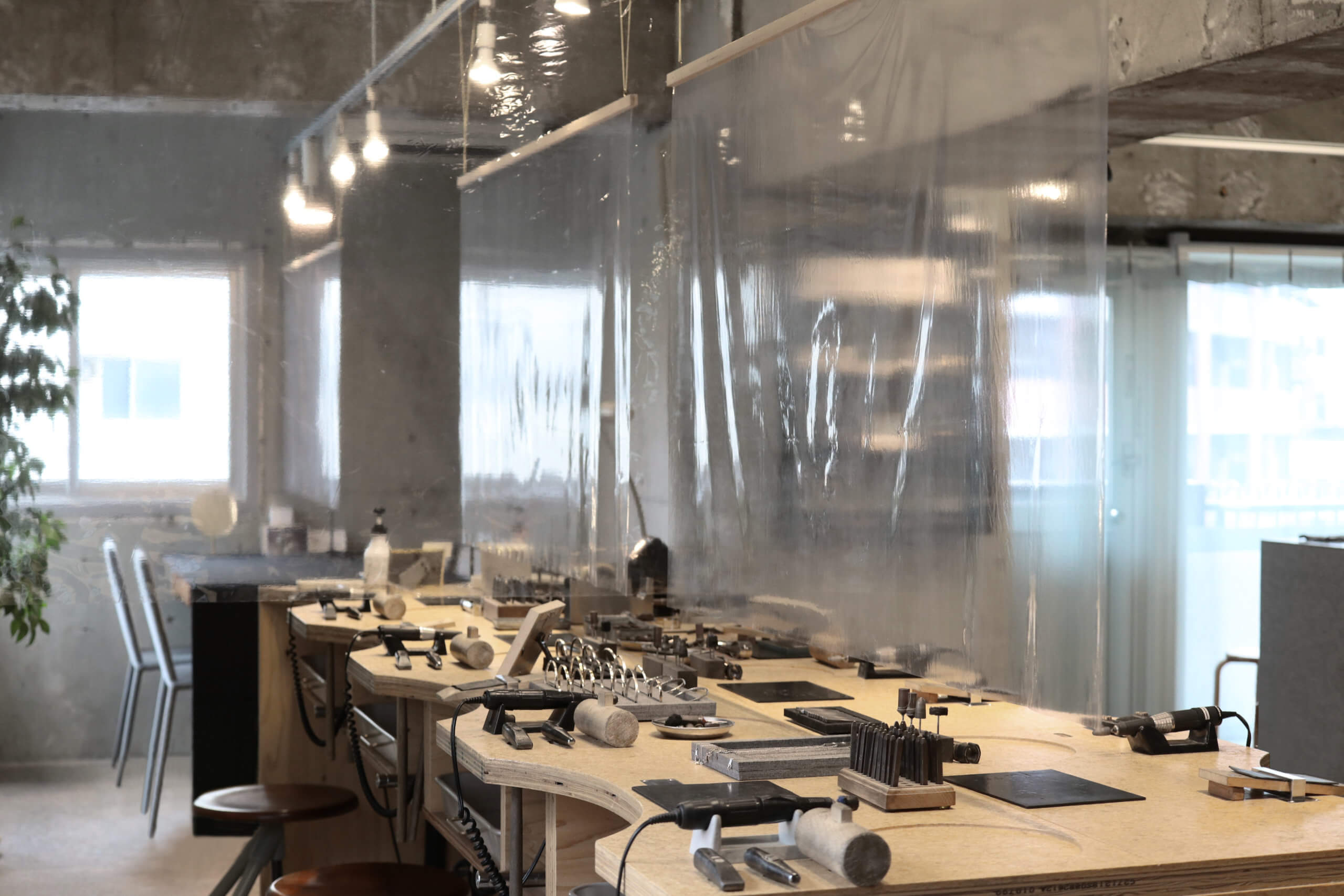 スタッフは工房入室時にアルコール消毒を徹底します。お客様が使用される工具・机・椅子に関してはご来店前に消毒・清掃を行っております。また、ご来店されたお客様にもアルコール消毒をお願いしています。アレルギーやキズ等でアルコール消毒が難しい場合は、石鹸による手洗いをご案内しています。