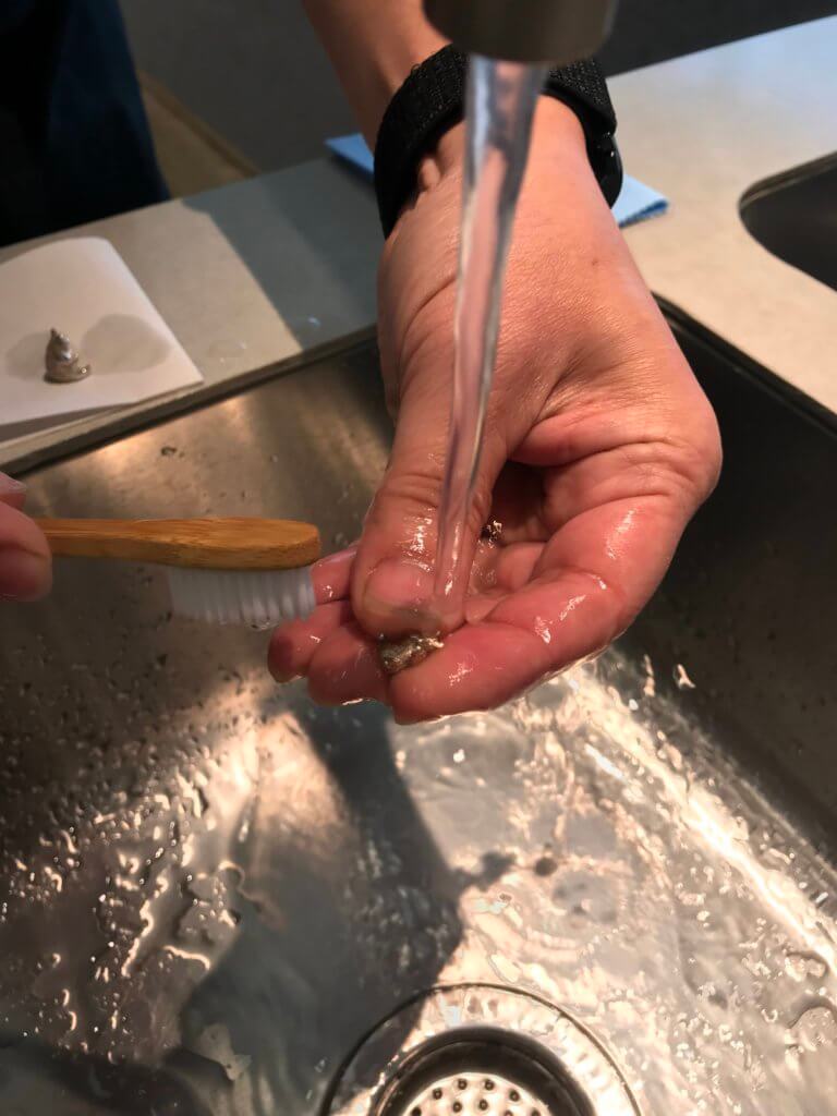 ①ぬるま湯で流しながら表面の汚れをブラシを使って落とします。