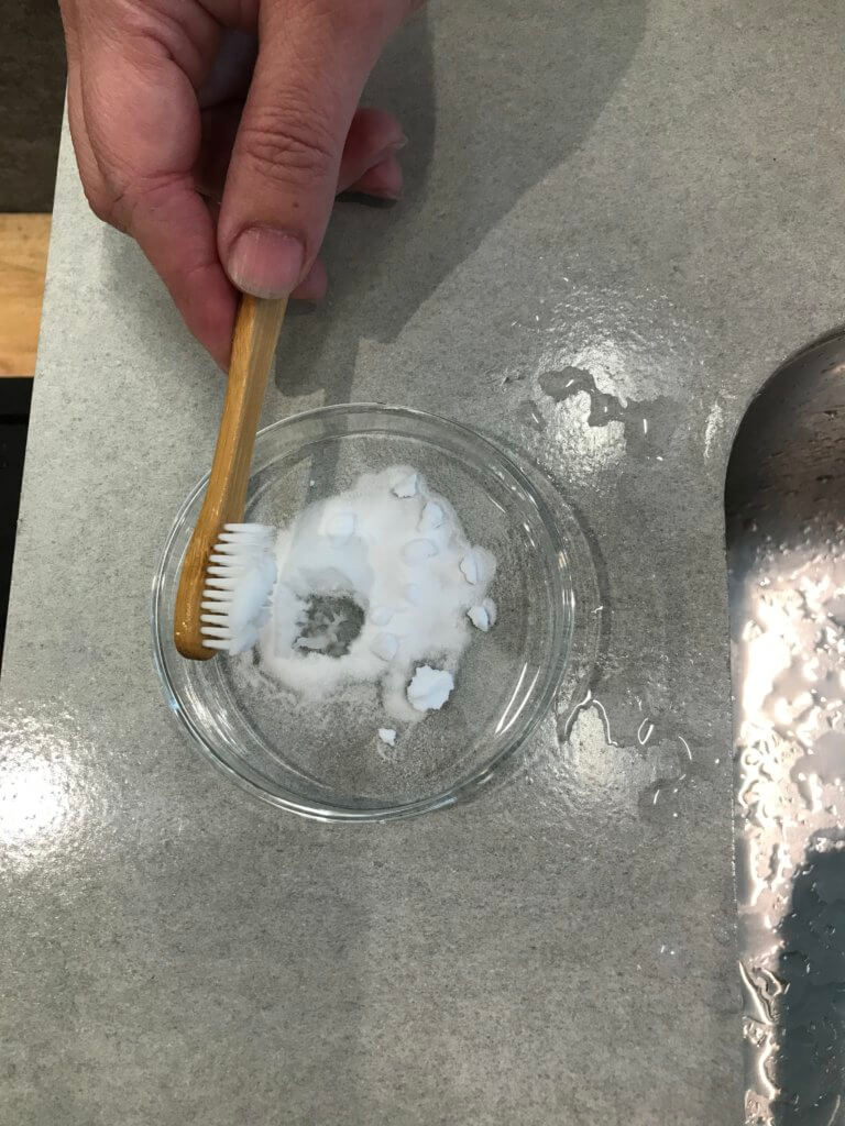 ②水でぬらしたブラシの先に「重曹」をつけて表面をやさしくこすります。