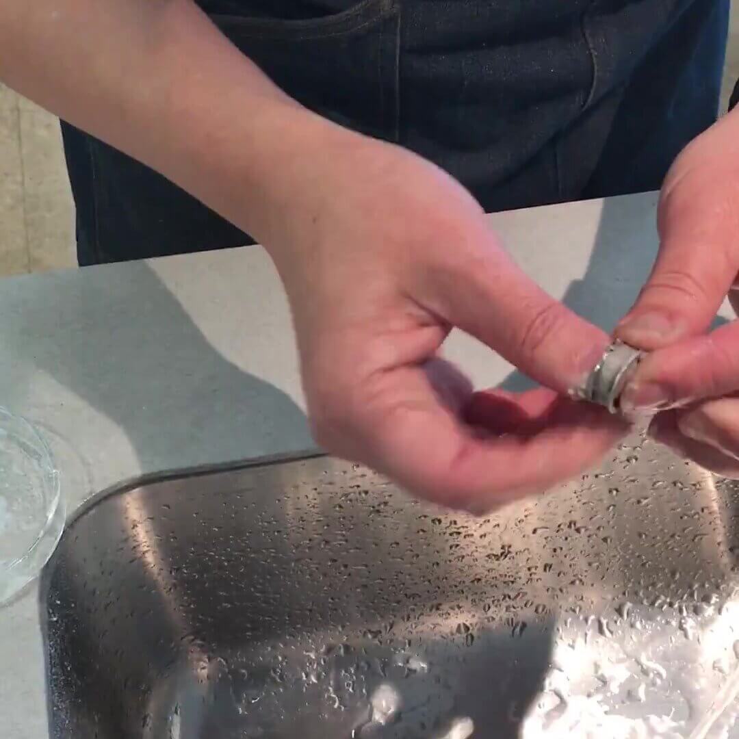 ここまではクリーニングセットを使って変色をとりましたが、さらに綺麗にする場合はMITUBACIの工房で「イオン洗浄機」や「変色をとる専用の溶剤」を使用します。