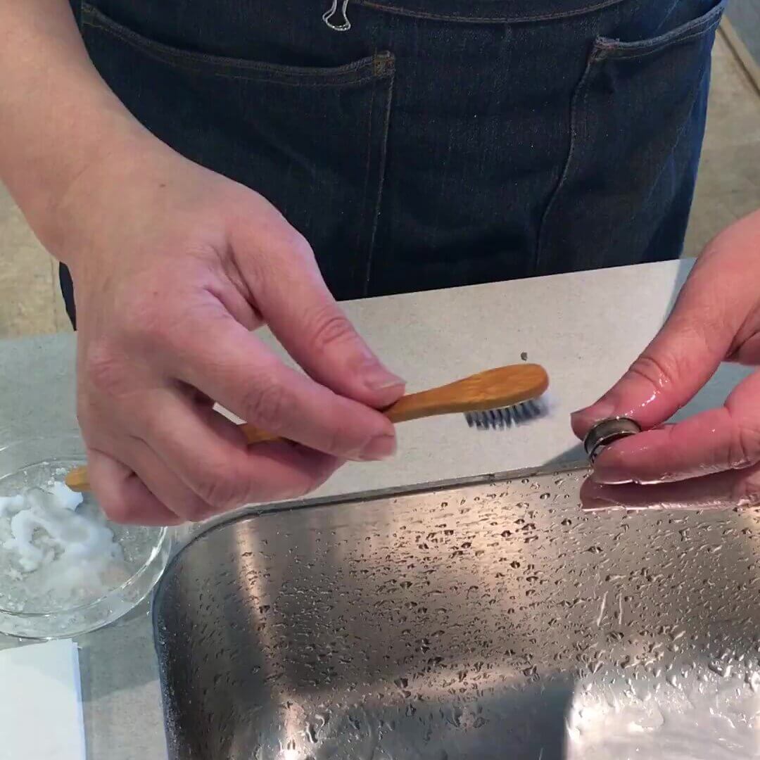 ※ここで注意! 重曹を指に着けて磨くと変色はよく取れますが同時に細かな傷もつけてしまう可能性があります。ブラスト(艶消し)加工の表面や鏡面仕上げで軽い変色を落とす場合はブラシに重曹を付けて優しく洗ってくださいね!