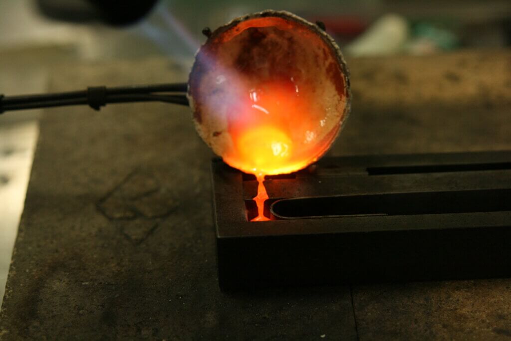 鋳造は溶かした金属を型に流し込んで作る製法です。一度も金属を鍛える過程がないため、密度にムラがあり結晶の向きも整いません。さらに、金属を流し込む過程で気泡が入り込みやすく、専門用語で’ス’と呼ばれる内部に小さな穴ができることがあります。結果として、出来上がった指輪は鍛造に比べて耐久性が低く、精度高く仕上げることが難しい点がデメリットです。