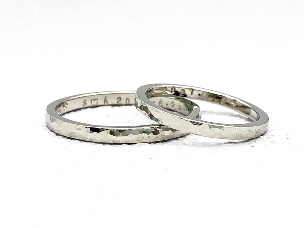 細身のプラチナ結婚指輪に、お揃いの槌目模様を施したT様の指輪をご紹介します。
