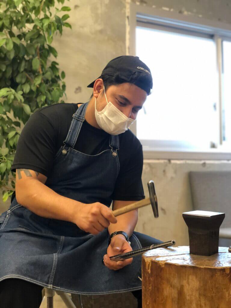 槌目の模様は、先端が丸くなった金槌で打ち込んでいきます。