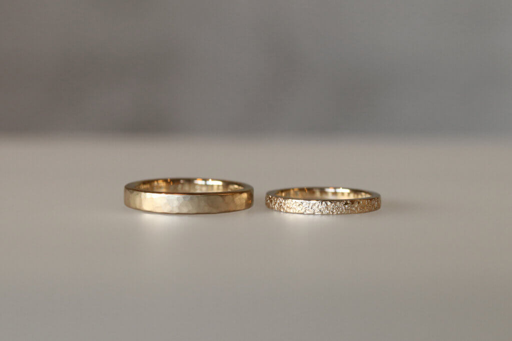 ・K18シャンパンゴールド<3.0mm幅> 槌目仕上げ+つや消し(ブラスト)、リング内側に手打ち刻印(写真左)