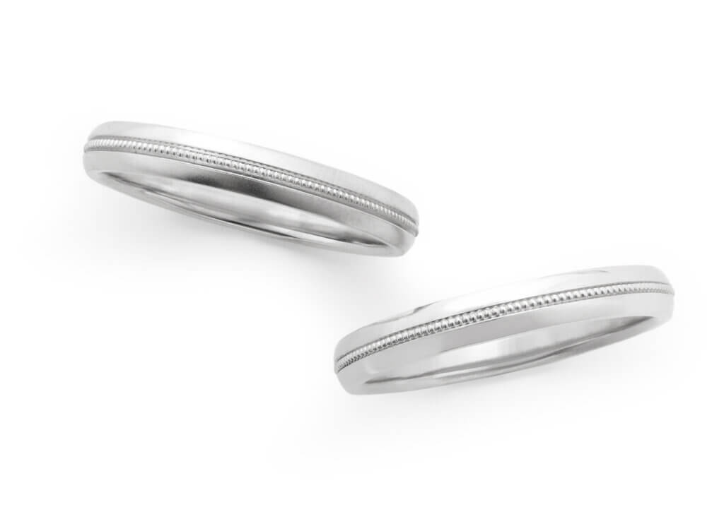 オーバルの形に整えたリング中央に、線状の溝をアクセントとして入れます。左の写真の指輪のように、指輪全体をつや消しにすることもできます。つや消しされた指輪の上のラインは、より強調されますね。