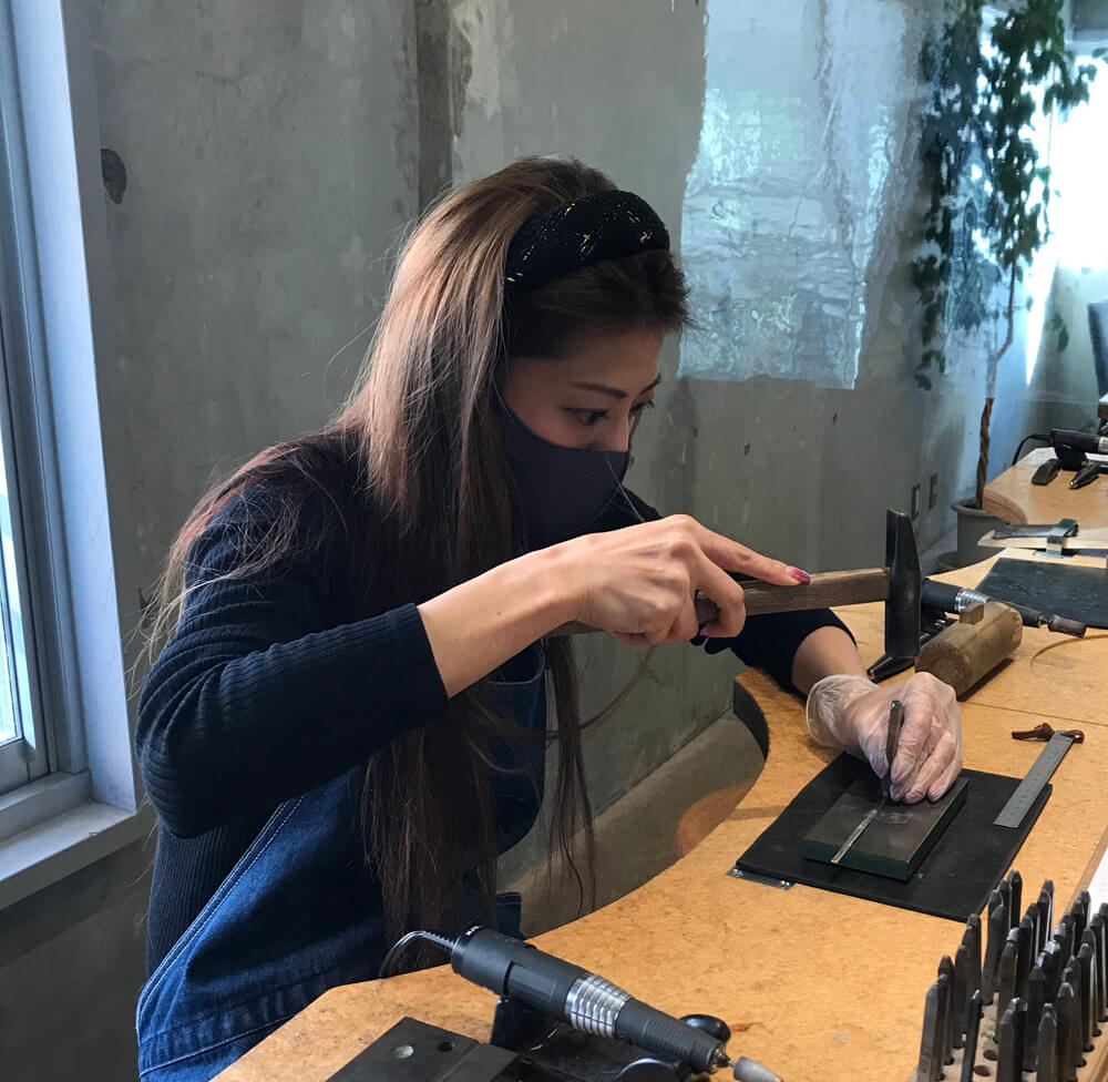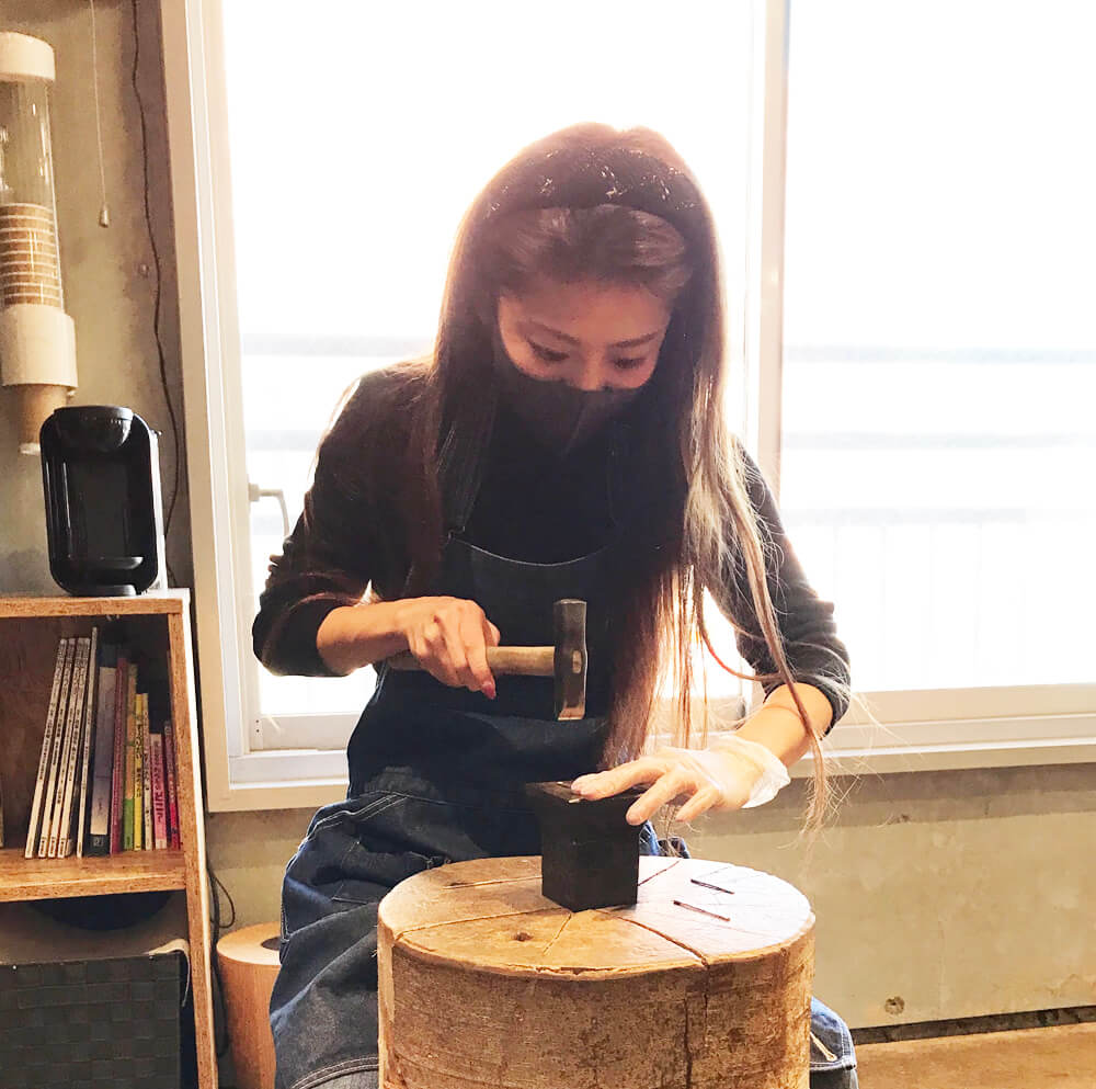 フォレスタという槌目をお選びいただきました。模様もご自身でハンマーで打っていきます。
