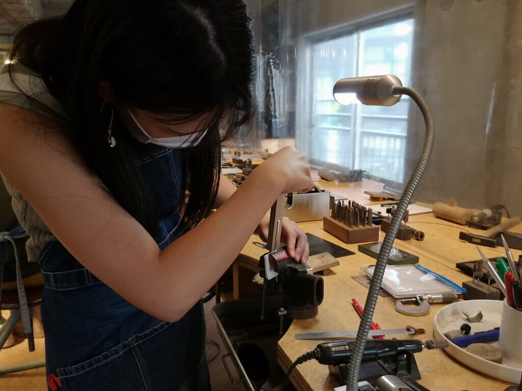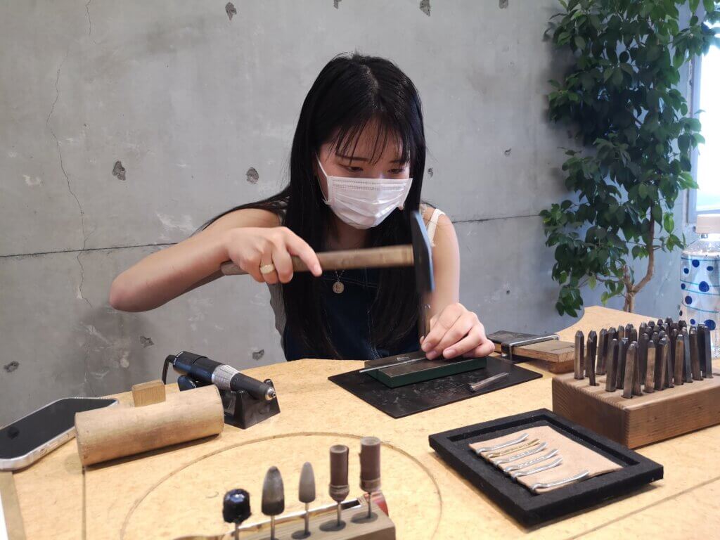 タイピンの形に曲げたときに、表側になる半分に、専用のハンマーを使って模様をつけていきます。