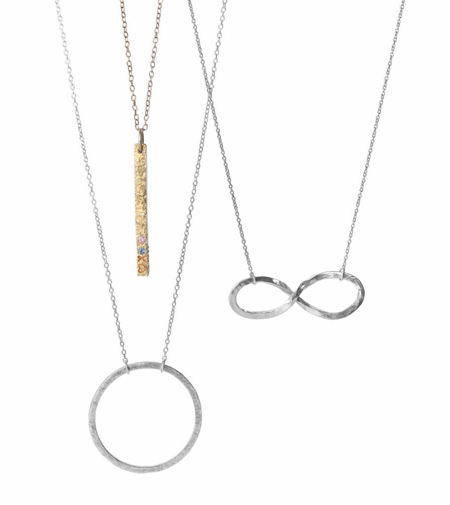 多様なデザインでさりげなく胸元を飾る手作りペンダント。角線を使った「ストレート」、細目の角線を輪にした「フープ」など、自由度の高いデザインが可能です(ループ・フープのデザインには文字入れ、石入れの加工はできません)。