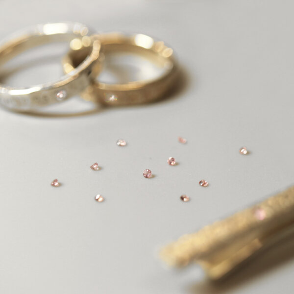 銀の表面にメッキ加工を施せば、ピンクやイエローゴールドの色合いを出すことができ、ゴージャスな印象に仕上げることができます。また、変色を防ぎ美しいプラチナカラーを保つ、ロジウムメッキコーティングもできます。