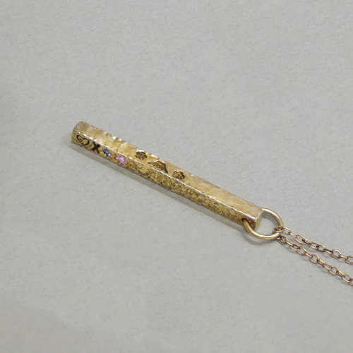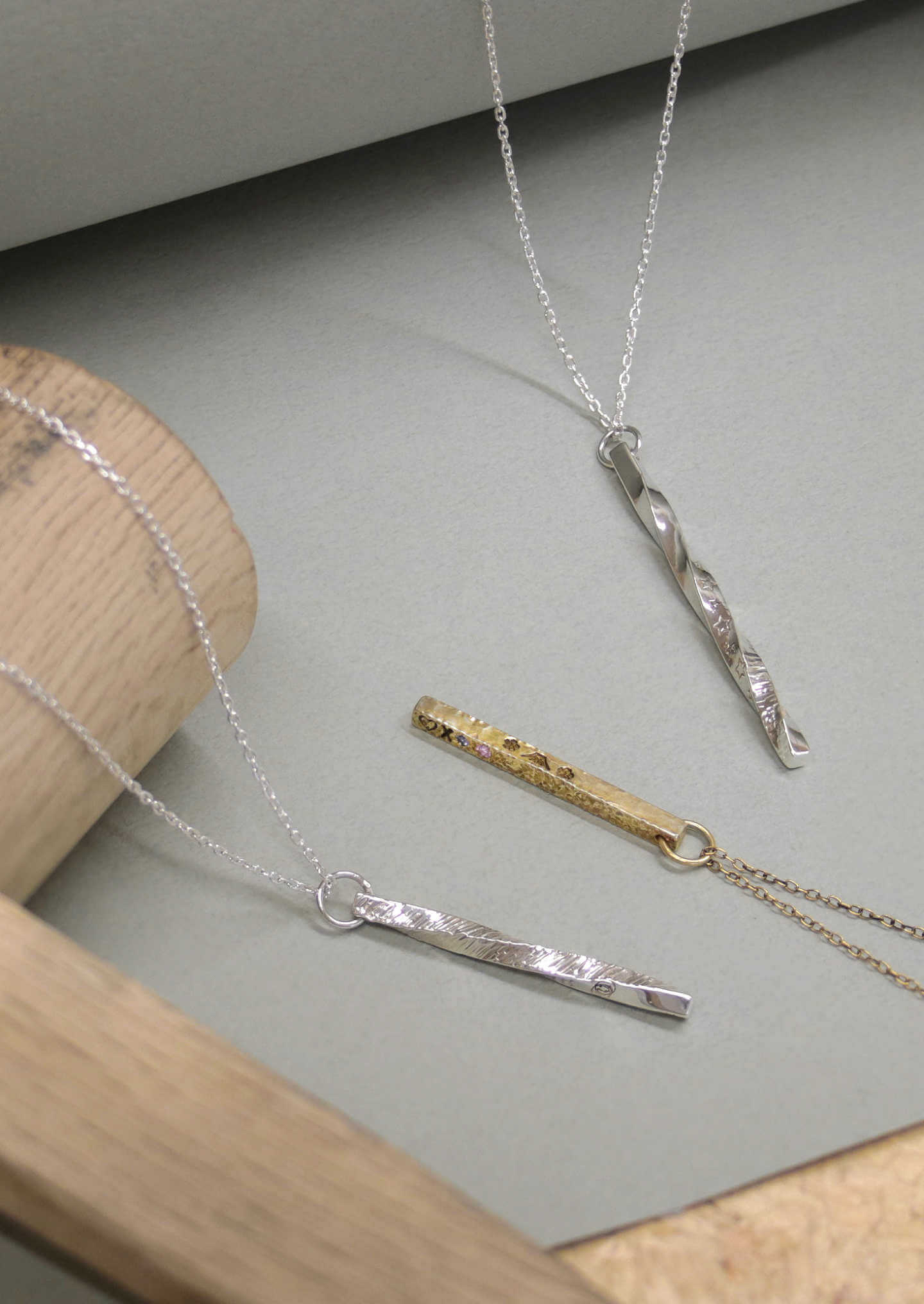 MITUBACIの手作りペンダントコースは、シルバーの角線に表面加工や曲げ加工を施することにより、作り手のオリジナリティが存分に表現できるネックレスを制作できるワークショップです。もちろんペアのネックレスに仕上げることもできます。お出かけのコーディネートにひときわ輝くペンダントを手作りしてみませんか?