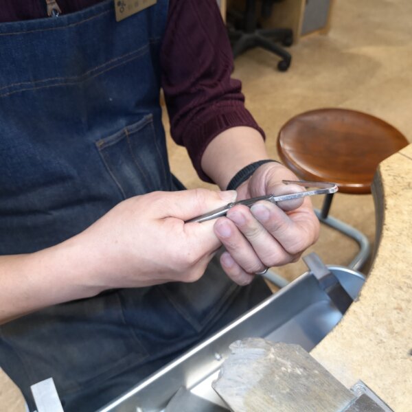 刻印の溝や鎚目の凹凸にいぶし処理を行い、へこんでいる部分を黒く仕上げます。