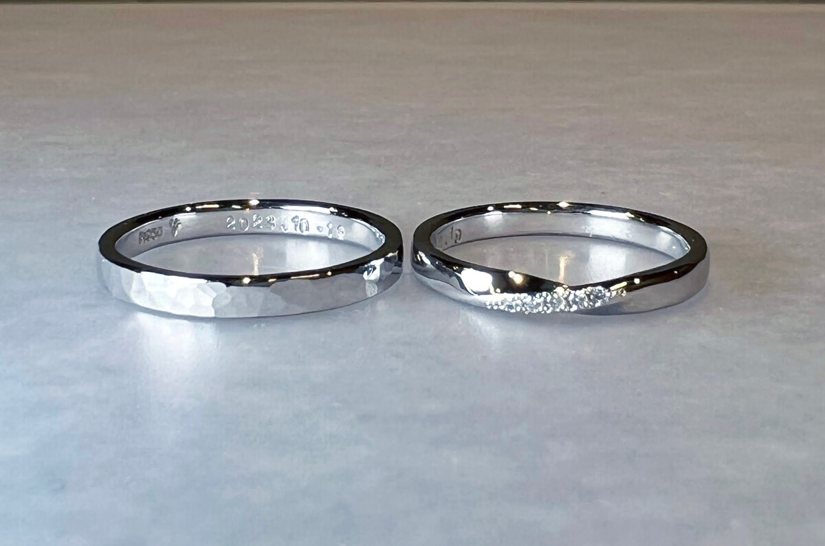 最受欢迎的锤纹结婚戒指和华丽的手工结婚戒指,五颗钻石镶嵌在一个扭曲的戒指上。*将五颗钻石固定在麻花上的过程由工匠完成。固定宝石的过程需要时间,因此我们希望您能在第二天或更晚些时候将宝石交给我们。镶嵌五颗钻石的手工婚戒。锤纹婚戒(在...)照片左侧。) Hammered 铂金950 手敲刻字 2.5毫米宽 ¥77,000扭转式婚戒,配钻石搭扣。(在...)照片右侧。) 扭曲 (Twist) 铂金950 钻石 手敲刻字 2.5毫米宽 ¥165,000(在...)) ¥ 投稿ナビゲーション镶嵌闪亮钻石的手工锤制结婚戒指最受欢迎的锤纹婚戒